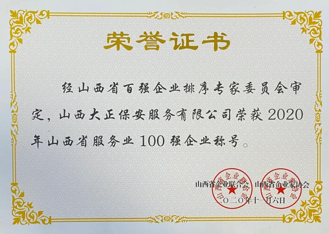 山西大正保安服務有限公司入榜“2020山西服務業(yè)企業(yè)100強”