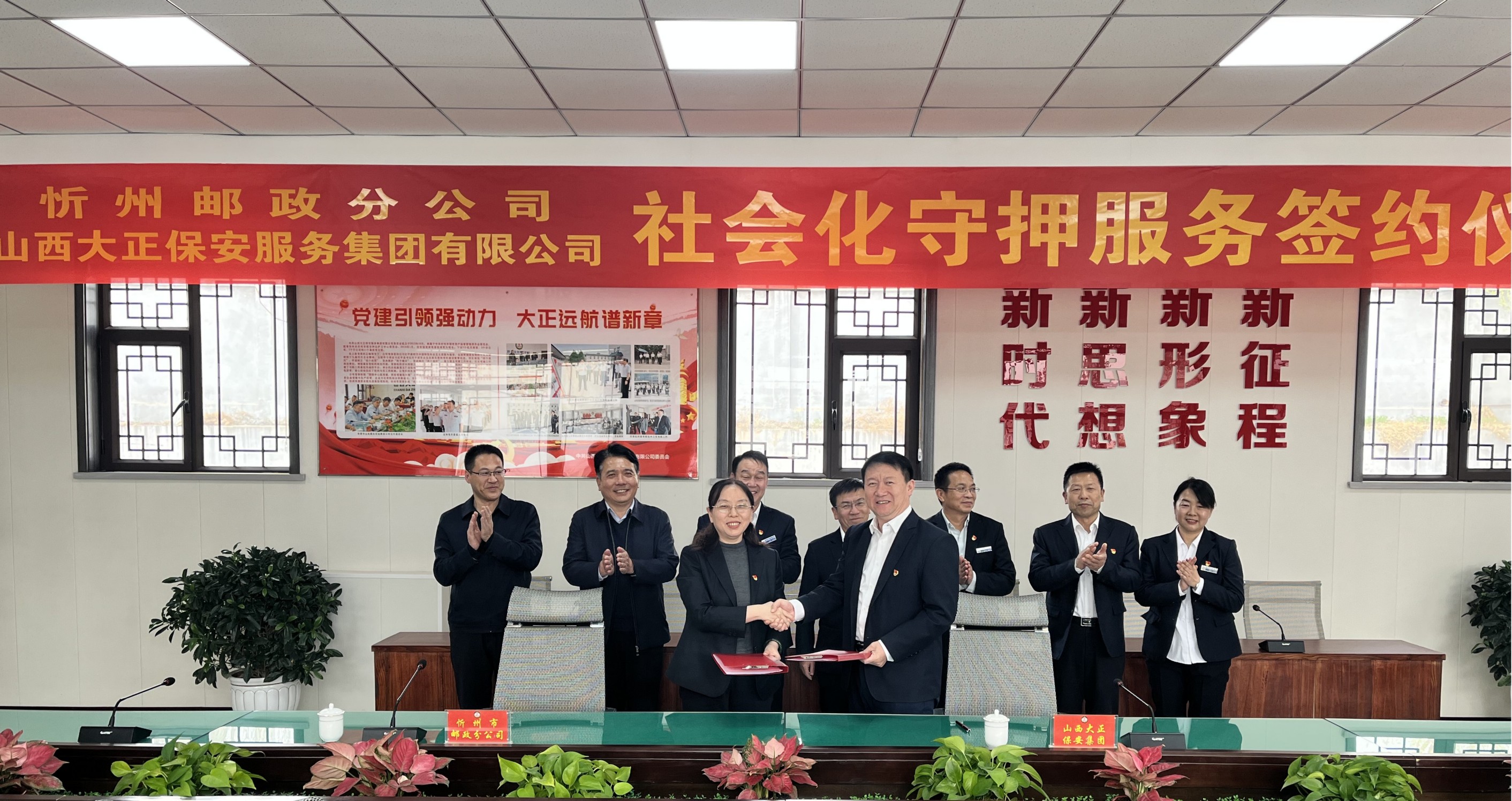 中國郵政集團忻州市分公司黨委委員、副總經理高茂懷,安保部主任李靜宇;山西大正保安集團黨委委員邢春生,董事、正大物業(yè)公司總經理呂雙明,總經理助理羅鵬生、宋林兔,守押綜合部主任韓美芳出席簽約儀式。