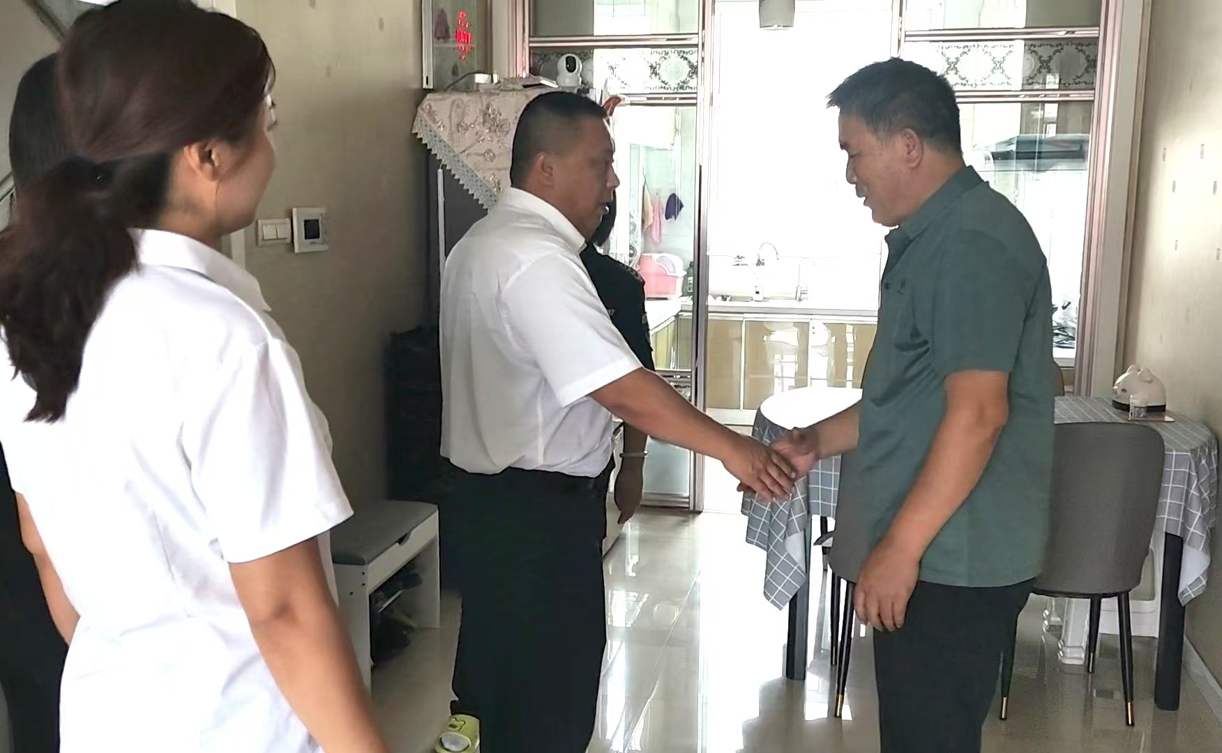 慰問成員一行來到位于榮玨苑胡曉霞父親家中,受到了老人的熱情接待,張龍與老人親切交談,了解老人身體、生活情況。在交談中得知老人一生從事教育事業(yè),在35年的執(zhí)教生涯中,一直在五臺縣鄉(xiāng)村初中教書育人,培育出許多人才,為家鄉(xiāng)的教育事業(yè)做出了不平凡的貢獻。張龍代表億通公司黨支部向老人一生奉獻教育事業(yè)表示崇高的敬意,叮囑老人保重身體,安享退休生活。他講到正是有了老人愛崗敬業(yè),無私奉獻精神的言傳身教,才培養(yǎng)出了像胡曉霞這樣踏實工作,認真負責的同志,在億通公司執(zhí)機值守崗位辛勤耕耘,努力工作為億通公司的穩(wěn)步發(fā)展作出了積極貢獻。