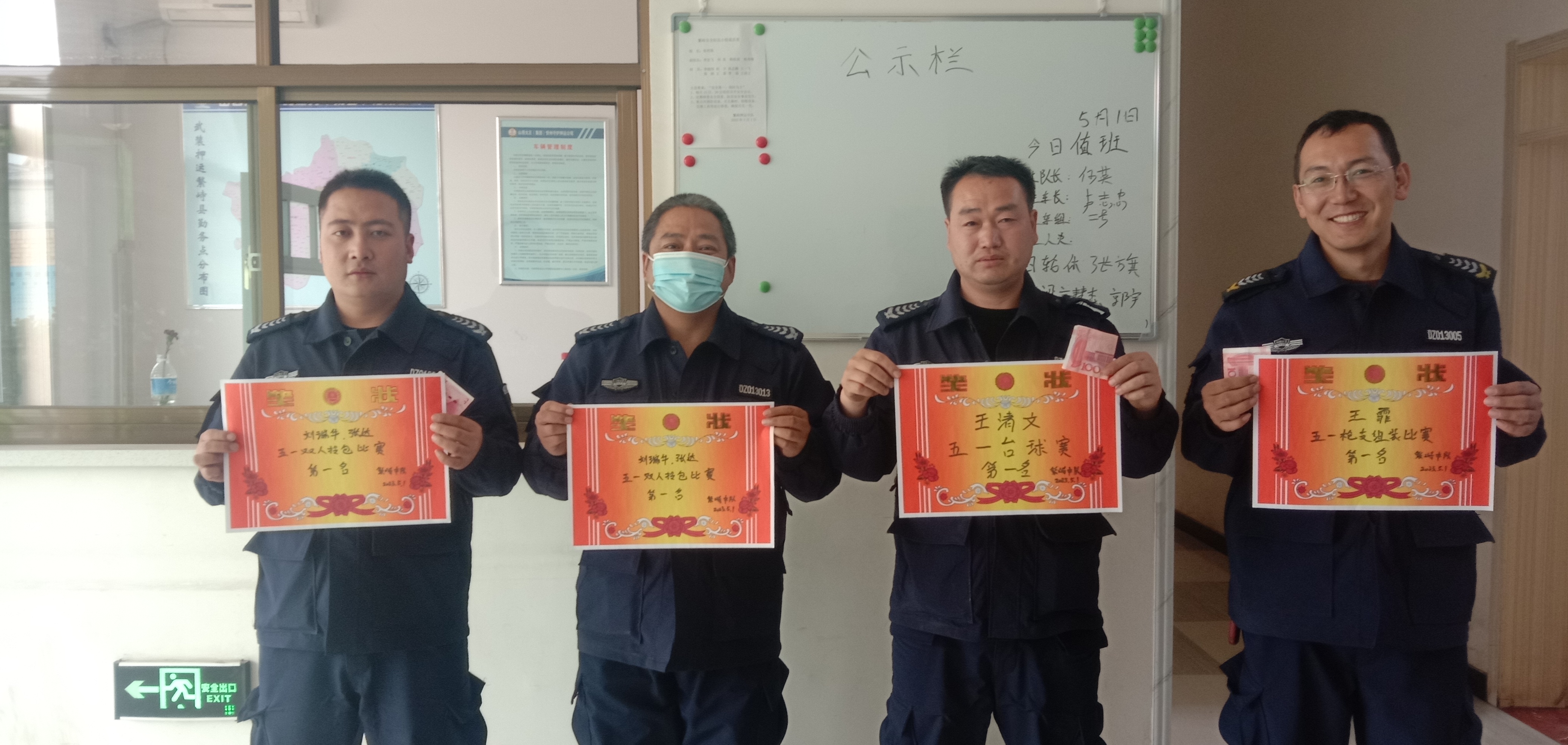 勞動(dòng)創(chuàng)造世界,勞動(dòng)更創(chuàng)造未來(lái)。由于我們工作的特殊性,五一勞動(dòng)節(jié)期間,中隊(duì)全體守押隊(duì)員依舊堅(jiān)守在各自的工作崗位上。中隊(duì)為加強(qiáng)隊(duì)員們的參與感和鍛煉團(tuán)隊(duì)協(xié)作精神,組織了雙人拎包賽、槍支組裝賽和桌球比賽。通過(guò)比賽活動(dòng),加強(qiáng)了隊(duì)員們的個(gè)人和集體榮譽(yù)意識(shí)、競(jìng)爭(zhēng)意識(shí)。最終王霏同志獲得槍支組裝賽第一名;張達(dá)和劉瑞華同志獲得雙人拎包賽第一名;王清文同志獲得桌球賽第一名。